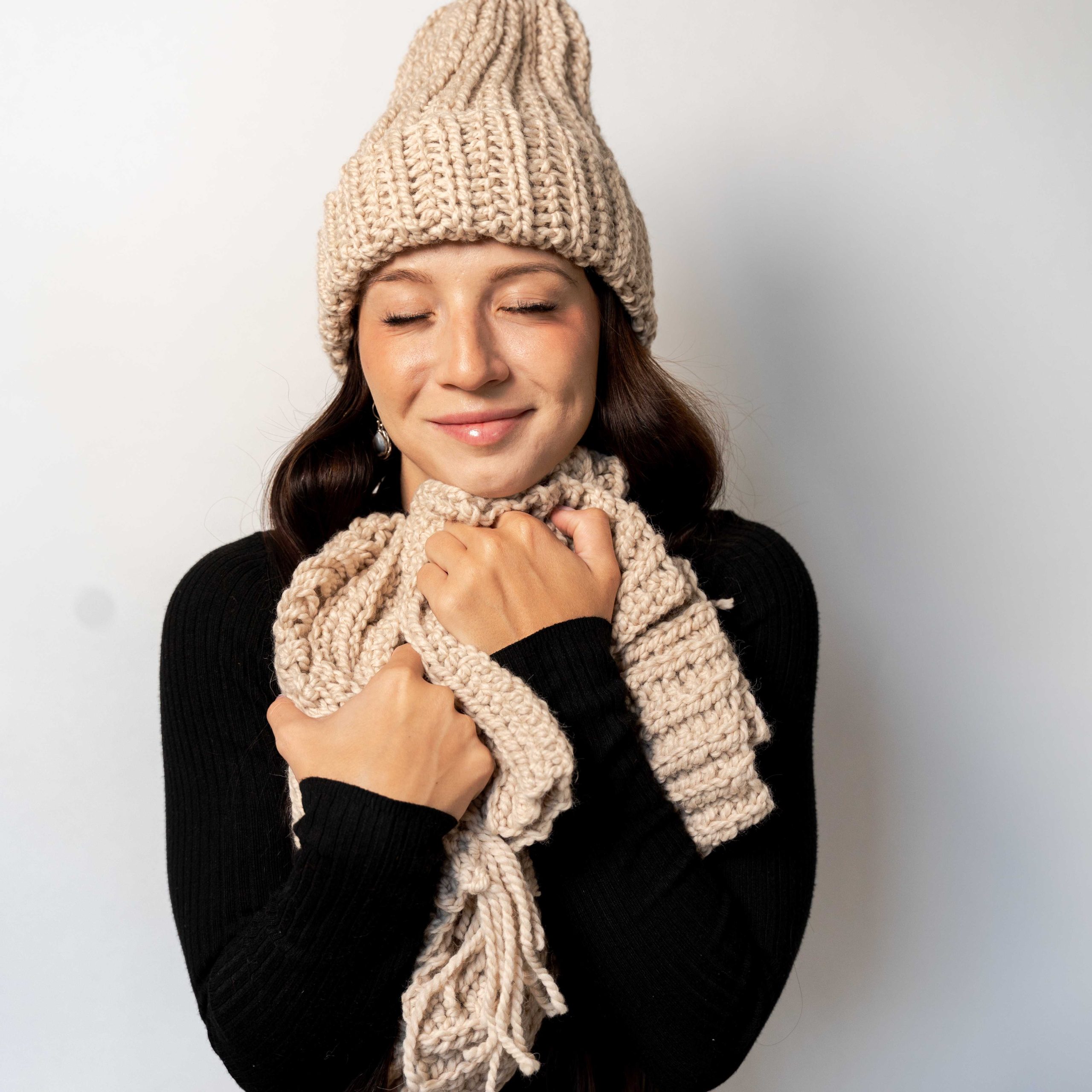 Każdy element zestawu Luna & Aura powstaje w duchu slow fashion – jest ręcznie dziergany na szydełku z niezwykłą dokładnością. Identyczny ścieg i kolor sprawiają, że czapka i szalik tworzą perfekcyjnie dopasowany komplet – subtelny, ale wyrazisty.
